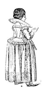 Женская фигура оказалась закованной в корсет с металлическими или деревянными планшетками. Корсет имел длинный шнип — выступ, оканчивающийся острым углом, благодаря которому плоская грудь плавно и невидимо переходила в юбку. На бедра надевался кринолин — каркас из нескольких конических уменьшающихся в диаметре кругов, висящих на кожаных ремнях, что сообщало юбке неподвижность и правильную коническую форму – вертугадэн.[1]