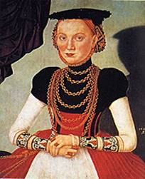 В XVI веке знатные женщины употребляли драгоценные украшения: цепочки и цепи с массивными, вделанными в ювелирные оправы камнями, жемчужные подвески.