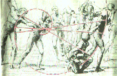 На подготовительном эскизе Рафаэля проведены красные линии, идущие от смыслового центра композиции - точки, где пальцы воина сомкнулись вокруг лодыжки ребенка, - вдоль фигур ребенка, женщины, прижимающей его к себе, воина с занесенным мячом и затем вдоль фигур такой же группы в правой части эскиза. Если естественным образом соединить эти куски кривой пунктиром, то с очень большой точностью получается ...золотая спираль! Это можно проверить, измеряя отношение длин отрезков, высекаемых спиралью на прямых, проходящих через начало кривой.