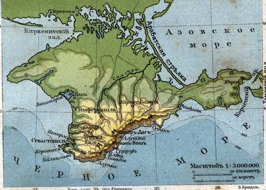 Полуостров Крым соединен с материком узким (около 7 верст) Перекопским перешейком и занимает меньше половины Таврической губернии. Его большая северная часть , почти три четверти всего полуострова, составляет продолжение Новороссии и ничем не отличается от последней. Наоборот, южная часть представляет собой такие резкие отличия в рельефе, природе и населении, что несмотря на свою незначительную величину, выделяется в отдельную область, которая собственно и носит название Крым. Это небольшая горная страна, занимающая в длину около 107, а в ширину около 30 верст; между горами и морем лежит узкая (2 – 8 верст) полоса земли – южный берег Крыма.