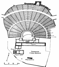 Театр Диониса в Афинах. Древнейшим из известных театральных зданий является театр Диониса в Афинах, расположенный в священной ограде Диониса на юго-восточном склоне Акрополя в последующие эпохи несколько раз перестраивавшийся. Его раскопки были завершены в 1895 г. Дёрпфельдом. По двум незначительным остаткам стены Дёрнфельд установил круглую орхестру — террасу с диаметром 27 м. (Э. Фихтер считает диаметр этой орхестры равным приблизительно 20 м). Она была расположена на склоне Акрополя таким образом, что её северная часть вдавалась в гору, а южная — подпиралась стеной, поднимавшейся в самой южной части на 2-3 м над уровнем священной ограды Диониса и на западе вплотную соприкасавшейся с старым храмом. Никаких каменных сидений в этом театре еще не было: зрители сидели на деревянных скамьях, а, может быть, на первых порах и просто стояли. Византийский учёный Свида сообщает, что в 70-ю олимпиаду (т. е. в 499—496 до и. э.) временные сидения обрушились и что после этого афиняне соорудили театрон, т. е. особые места для зрителей. Скена вначале не обозначала дворца или храма. Однако более поздние пьесы Эсхила и драмы Софокла уже требовали в качестве задника дворца или храма, и на касательной орхестры стали сооружать деревянное здание скены, на фасаде которого вскоре появились 3 двери. В это же время входит в обиход и сценическая живопись, причём расписные доски могли расставляться между колоннами проскения. При Перикле театр подвергся перестройке, закончившейся, вероятно, после его смерти. Старая орхестра была отодвинута к северу. Таким образом, было достигнуто несколько большее пространство для представления актёров и для сценических приспособлений, требовавшихся развитием драмы Софокла и Еврипида. Южная граница террасы была полностью перестроена, и вместо старой кривой опорной стены была сооружена из крупных глыб конгломерата длинная (около 62 м) прямая стена, поддерживавшая террасу. На расстоянии приблизительно 20,7 м от западного конца стены выступает к Скене примерно на 2,7 м солидный фундамент, имеющий в длину около 7,9 м . Предполагают, что он служил опорой для машин, применявшихся в театре. Но сама скена была еще из дерева. Несколько южнее старого храма был построен новый храм Диониса, в котором была помещена статуя бога из золота и слоновой кости, изваянная Алкаменом. Опорные стены зрительских мест соприкасались с одеоном — зданием для музыкальных состязаний, постройка которого была закончена Периклом в 443 до н. э. Сидения в этом перестроенном театре были всё еще из дерева, за исключением, может быть, некоторых почётных мест. Имелись параскении. Здание скены при постановке, требовавшей изображения дворца или дома, было обычно двухэтажным, причём верхний этаж, возможно, несколько отступал назад и оставлял актёрам пространство спереди и с боков. Храм мог иметь остроконечный фронтон. Перикловская реконструкция была завершена сооружением стоп — большого зала, идущего вдоль всей длины новой опорной стены, с открытой колоннадой на его южной стороне. Следующая большая перестройка афинского театра происходила во 2-й пол. 4 в. до н.э. (завершена ок. 330) и была связана с именем Ликурга, заведовавшего афинскими финансами. Вместо временных деревянных строений была построена постоянная каменная скена. Параскении выступали прибл. на 5 м от фасада скены. 