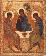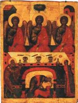 Ветхозаветная сцена посещения дома Авраама тремя вестниками-ангелами изображена русским художником в символическом ключе, без нарративных подробностей, без фигур Авраама и Сарры. Он изобразил трех ангелов как символ единосущия и равенства трех лиц Пресвятой Троицы, согласно православному Символу веры. Впечатление единства трех ангелов достигается и общностью их душевного состояния, их тихой и светлой скорби, и особенностями композиции. Фигуры словно вписаны в мысленный круг, внутри которого, согласно направлению склоненных голов, совершается медленное движение, замкнутое, повторяющееся, бесконечное. При всей схожести ангелов, среди них слегка выделен центральный, в одежде которого (пурпурный хитон и синий гиматий, золотой клав на плече), в жесте руки, расположенной ближе других к чаше, которая есть чаша жертвенная, евхаристическая, присутствует указание на Бога Сына, второе лицо Троицы. Соответственно, левая фигура символически указывала на Бога Отца, а правая — на Св. Духа.