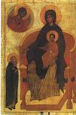 Во времена Андрея Рублева в иконописи Москвы существовали и иные течения. Так, на одной из икон изображен прп. Сергий Радонежский, предстоящий перед Богоматерью, которая восседает на престоле, придерживая Младенца (ил. 58). Наиболее часто такие композиции в Византии изображали ктитора. В данном случае прп. Сергий представлен как основатель монастыря (вероятно, Благовещенского Киржачского) и как смиренный инок, молитвенно сложивший руки на груди, принимая Благодать от Богоматери. Его фигура, хотя и мала, стоит у самого престола, и значительность Сергия Радонежского подчеркивается многими символическими ассоциациями. Высокий престол с округлой спинкой ассоциируется с понятием трона Премудрости, с идеей Богоматери как одушевленного Храма, как Престола Божия. Архангел Гавриил, представленный в медальоне слева, вверху, указывает на Благовещение как на чудо Воплощения Христа. Крупные, тяжелые формы, пространственность и перспектива в изображении трона, округлые лики напоминают о приемах византийской живописи XIV в.