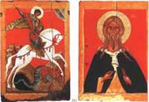 Самые запоминающиеся новгородские иконы исполнены на ярко-красных фонах, в цвете которых, через множество промежуточных звеньев, дошла до нас традиция античной, эллинистической живописи, где тоже часто использовались красные фоны. В «Чуде св. Георгия о змие» (ил. 66) всадник на белом коне словно вечно парит над горами и. кажется, никогда не отпустит змея. Икона напоминает позднеантичные изображения победоносных всадников. Однако главное в иконе — торжество христианской веры, которая, через десницу Господа, простертую с небес, придает храброму воину неземное могущество в борьбе с силами зла. В изображении пророка Ильи (ил. 67) прославляется необыкновенная духовная мощь библейского пророка, его дар чудотворений, власть над земными стихиями, дарованная ему Господом. Огромная энергия передается и потоками алого цвета, и острыми клиновидными очертаниями, многократно повторенными, и особым взглядом круглых глаз, которые словно видят те таинственные неземные дали, которые скрыты для простых смертных.