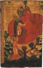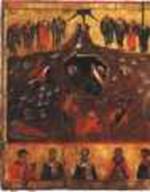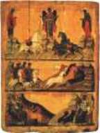 В «Огненном восхождении Ильи Пророка» (4 Царств, 2:1-14) главная фигура — сам пророк Илья, отмеченный особым благословением Господа и взятый на небо живым (ил. 69). К пророку обращаются и архангел, придерживающий огненное облако, и молитвенно поднявший руки ученик его пророк Елисей. Но, в отличие от композиции ХIII в. (ср. ил. 21). сам пророк Илья указывает на небо, и смысловым центром композиции оказывается пространство небес между указующей рукой св. Ильи и благословляющей десницей Господа, простертой из облаков. Более сложный, нарративный характер имеет произведение «Чудо от иконы «Знамение» (ил. 70). В нем представлено, как икона «Богоматери Воплощение», изображающая молящуюся Богоматерь с воплотившимся Младенцем на груди, спасла Новгород от осады суздальского князя Андрея Боголюбского. Вверху показано, как икону несут из небольшого храма, по мосту через реку Волхов, к крепости с новгородским Софийским собором внутри. Ниже — крепость с новгородским войском, переговоры послов, суздальские воины, не почитающие новгородскую икону и выпускающие в нее стрелы. Внизу — новгородское войско во главе со свв. Георгием, Борисом, Глебом, Александром Невским побеждает суздальцев с помощью ангела. В каждом ярусе представлена встреча двух групп, их диалог или борьба. Икона внешне напоминает миниатюры исторических хроник, иллюстрации к Акафисту Богоматери, где изображалось поклонение иконам, но более всего она заставляет вспомнить византийские предания о спасении Константинополя от военной угрозы благодаря помощи чудотворной иконы Богородицы. Новгород, как город праведных христиан, почитающих чудотворную икону, здесь как бы мысленно сравнивается с самим Константинополем.
