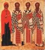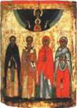 74 Параскева Пятница, Григорий Богослов, Иоанн Златоуст и Василий Великий. Начало 15 в. Третьяковская галерея. Москва