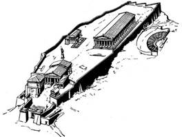 На холме Акрополя, таким образом, разместились основные святилища афинян и прежде всегр Парфенон — храм Афины Девы, богини мудрости и покровительницы Афин. Там же помещалась казна Афин; в здании Пропилеи, служившем входом на Акрополь, находились библиотека и картинная галлерея (пинакотека). На склоне Акрополя собирался народ на драматические представления, связанные с культом бога земного плодородия Диониса. Крутой и обрывистый, с плоской вершиной, холм Акрополя образовывал своего рода естественный пьедестал для венчающих его зданий.