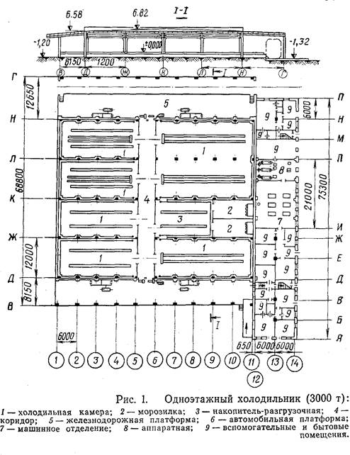 Одноэтажные холодильники. Эти холодильники (рис.1) имеют сравнительно простую строительную конструкцию, так как основная нагрузка (от продуктов) передается непосредственно на грунт, колонны же воспринимают сравнительно небольшую нагрузку, создаваемую верхним покрытием и продуктами, расположенными на подвесных путях. Это позволяет увеличить норму нагрузки на 1 м2 площади пола до 5000 кг, а следовательно, и высоту камер.