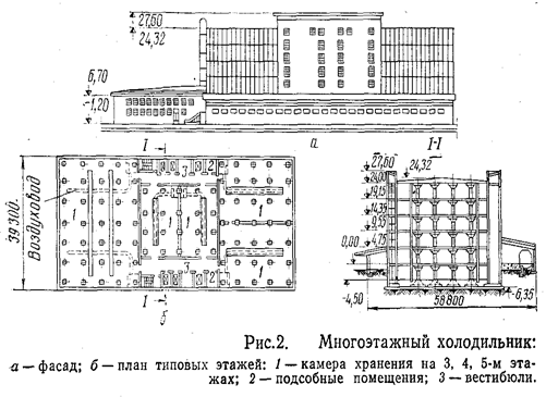 Здание многоэтажного холодильника представляет собой железобетонный каркас, состоящий из колонн, междуэтажных перекрытий и покрытия. Снаружи каркас закрывается самонесущими стенами и непрерывным слоем тепловой изоляции по всему наружному контуру. Нагрузка, создаваемая продуктами и железобетонными перекрытиями, воспринимается только колоннами и через фундаменты передается грунту. Высота этажей (от пола нижнего этажа до пола следующего этажа) 4,8-5,4-6,0 м и подвального этажа не менее 3,6 м. Расчетная полезная нагрузка на многоэтажные перекрытия 2000-3000 кгс/м2.