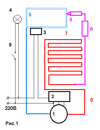 Мотор - компрессор (1), засасывает газообразный фреон из испарителя, сжимает его, и через фильтр (6) выталкивает в конденсатор (7).