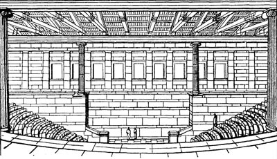 Более торжественным зданием этого типа был булевтерий (место заседаний буле — городского совета) в крупном эллинистическом центре — Милете. Построенный около 170 г. до н.э., булевтерий представлял собой опыт переработки элементов открытого античного театра. Как и в театре, места (числом около 1500), постепенно возвышаясь, располагались по полукругу. Там, где обычно помещалась «скена», поднималась стена, расчлененная пилястрами дорического ордера с окнами между ними. Четыре ионические колонны, расположенные внутри зала, служили промежуточными опорами перекрытия. Внутреннее помещение булевтерия производило величественное впечатление. Характерно, что наружные стены булевтерия были расчленены дорическими полуколоннами, соответствовавшими дорическим пилястрам внутренней отделки. Мы наблюдаем здесь одну из первых попыток установить взаимосвязь между внутренним архитектурным решением и решением фасада.