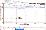 КРИВАЯ ИЗМЕНЕНИЯ ВЫСОТЫ РАСПОЛОЖЕНИЯ ТРАССЫ канала над уровнем моря. Канал имел очень малый уклон (в среднем 0,34 м/км). Эта величина получается делением 17-метрового перепада высоты (между Уцецией и Немаусом) на 50 км. Несмотря на небольшой уклон, глубина воды в различных участках канала была часто оптимальной и равнялась примерно 0,6 м. Внизу приведены значения глубины основных участков канала для периодов с разными расходами воды из источников: малым (светло-синий), средним (синий) и большим (темно-синий). Следует обратить внимание, что глубина была оптимальной в самой пологой части канала (непосредственно за мостом) при минимальном расходе воды и в конечной его части (между Сен-Жервази и Немаусом) при максимальном расходе. | |