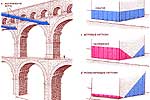 МОСТ, еще в большей степени чем канал, поражает воображение и не только благодаря ажурности своей конструкции, выдерживающей вес шеститонных камней, из которых он сооружен, но и потому, что он пережил почти два тысячелетия. Мост отличается сбалансированностью пролетных строений: его нижний ярус больше и массивнее среднего, который в свою очередь больше и массивнее верхнего яруса с проходившим по нему водоводом. Долина, которую пересекает мост, известна своими ураганными ветрами, а река под ним весной сильно разливается. Римские инженеры, вероятно, не умели точно рассчитывать опрокидывающие нагрузки под действием ветра и паводков. Даже и в наше время расчет таких нагрузок является сложной задачей. Невольно возникает вопрос, не решали ли древние строители эту проблему за счет избыточной прочности своих сооружений?