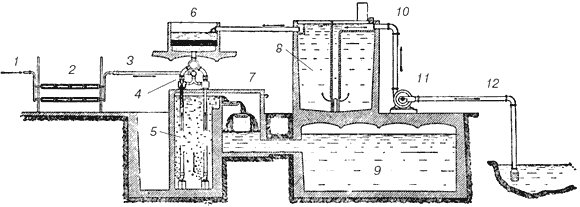 Рис. 1. Как устроена водоочистительная станция в Санкт-Петербурге 1 – воздух; 2 – батарея озонаторов; 3 – озон; 4 – эмульсер; 5 – стерилизационная башня; 6– быстродействующий фильтр; 7 – каскады; 8 – отстойник; 9 – бассейн для чистой воды; 10 – прибор для дозировки коалюганта; 11 – насос; 12 – сырая вода