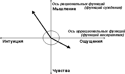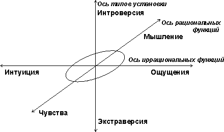 Фрейд описал эту ситуацию знаменитым лозунгом: «Где было ОНО, будет Я». Иными словами, должно произойти расширение сознания, экспансия сознания в области, прежде бывшие бессознательными. У Юнга эта тема описана гораздо подробнее. Согласно его теории, классификация типов личности может осуществляться с учетом преобладания (доминирования) той или иной психологической функции. Схему психики по Юнгу можно представить двумя парами противоположных (взаимоподавляющих) функций, расположенных на двух ортогональных осях (рисунок 1). На оси рациональных функций (функций суждения) располагаются мышление и чувства; на оси иррациональных функций (функций восприятия) - ощущения и интуиция.