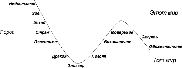 Так или иначе, Герой попадает в мир иной реальности, в царство архетипов, к самым истокам своей личности. Это центр мира, где растет Древо жизни и бьет неиссякаемый родник мировых вод. Здесь, на оси мироздания, Герой встречает Помощника, проводника, который должен провести его по миру иной реальности, иной логики, иного времени. Обретенный Помощник помогает Герою найти и победить Дракона, охраняющего волшебный эликсир - то, что должно спасти и обновить реальный мир Героя. Эликсир символизирует трансформацию, обретение новых психических качеств, а возвращение с ним в свой мир - интеграцию этих качеств в сознание, обретение над ними сознательного контроля. Таким образом, неотъемлемые базовые элементы архетипической схемы: зов - сражение со Стражем Порога - нисхождение в иной мир - встреча с Помощником - победа над Драконом - обретение эликсира - возвращение. Накрутки и усложнения могут быть очень значительными; но это - необходимый базовый минимум, который должен присутствовать. После магического путешествия Герой спасает свой народ, правит им, совершает подвиги и деяния, но затем допускает ошибку, теряет доверие людей и милость богов, и умирает таинственной смертью (а затем посмертно обожествляется). Круг замыкается. Вторая, «надводная» часть схемы не является обязательной.