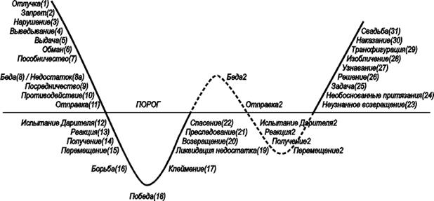 И в заключение сравним рассмотренную нами схему универсального мономифа Джозефа Кэмпбелла с морфологической схемой волшебной сказки Владимира Проппа. Кэмпбелл в своей работе руководствовался психоанализом - т.е. хотя и единственно верным учением, но все-таки руководствовался. Иными словами, он знал, что за чем должно последовать; в определенных местах он ожидал определенных результатов. А Пропп руководствовался марксизмом-ленинизмом, т.е. считайте, что ничем;[41] он непредвзято исследовал русскую волшебную сказку, и его исследования предшествовали его выводам. В результате мы имеем великолепные работы, материалами которых могут воспользоваться представители любой школы. Что мы и сделаем.