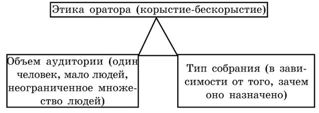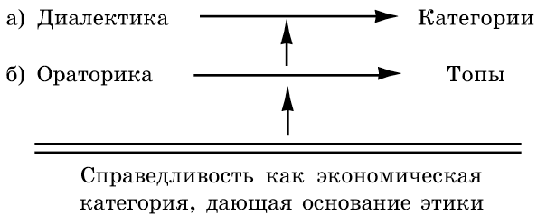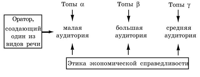 Для каждой аудитории и в каждом виде речи оратор, руководствуясь этикой экономической справедливости, избирает категории и топы для развития аргументации того или иного рода.