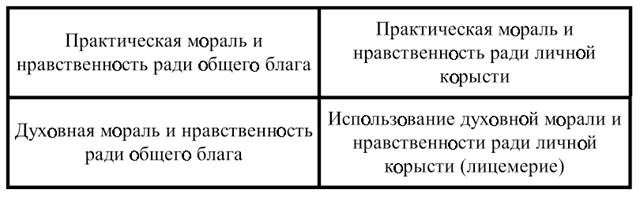 С точки зрения этики выделились два этических основания: практическая мораль и духовная мораль, а с точки зрения нравственной направленности все виды речи поделились на речь для общего блага и своекорыстную речь (Аристотель). В таблице 1.1 показано, что мораль и нравственные основания сочетаются как независимые составляющие.