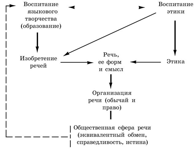 Схема 1.8 показывает, что феномен речи является не только тем, что составляет основной признак общества--- общение, но и дает представление о динамике развития общества благодаря речи.