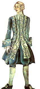 Влияние стиля рококо сказалось в мужском костюме в подчеркнуто узких объемах изделия и рукавов, в изогнутых линиях силуэта, мягком изысканном колорите и дорогих вычурных украшениях. Это соответствовало общему направлению в искусстве. Прямая линия считалась невыразительной и всюду заменялась кривой, изогнутой, волнистой.