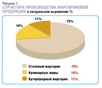 Рынок маргариновой продукции, достаточно устоявшийся, и большинство предприятий направляют свою деятельность на расширение ассортимента мягких маргаринов разной жирности с применением различных наполнителей (пряностей, трав и др.), усиление маркетинговой политики в продвижении кулинарных и кондитерских жиров для пищевой промышленности. Производство сливочного масла и маргариновой продукции имеет стабильную тенденцию роста. И если в 2005 г. темпы роста в среднем составляли около 14 %, то в 2006 г. увеличились до 23 %. Особенно активно развивается рынок именно маргариновой продукции. За последние четыре года значительно изменилась структура выпускаемой маргариновой продукции.
