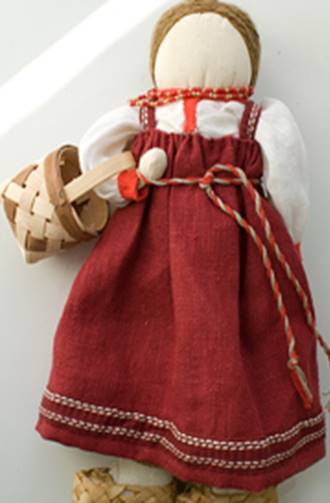 Исследователи считают, что наиболее ранняя среди традиционных игровых свёрнутых кукол была кукла “полено’’ , представлявшая собой деревянное поленце, наряженное в стилизованную женскую одежду. Позднее пришла более сложная кукла. Она представляла собой простейшее изображение женской фигуры. Туловище – кусок ткани, свёрнутый в “скалку”, тщательно обтянутое льняной тряпицей лицо. Кудельная, либо волосяная коса. Грудь из набитых ватой шариков. Костюм, как правило, с куклы не снимали.