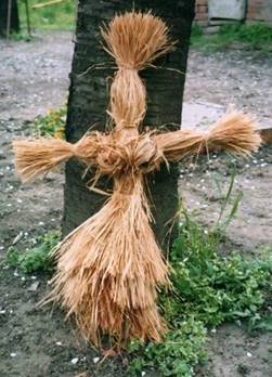 Не только детские куколки были оберегами. Жили в домах куклы-домовые. А разве огородная кукла-пугало не оберег? Оберег, да еще какой! Оберегает огородные посевы от птиц и скота. Да и детишки его побаиваются, лишний раз морковку с грядки не выдернут. А если эту куклу сделать еще крутящуюся, то на огороде ей цены не будет. Словно живой мужик или баба разгуливает по огороду, да еще и руками «отмахивается» от ветерка. Такие куклы можно увидеть и у нас на огородных участках. Одеты пугала по-разному: можно увидеть куклу в женском наряде, повязанную платком, а то и шляпе дырявой, и мужика с кастрюлей на голове вместо шляпы.