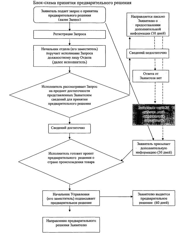 При необходимости представления дополнительной информации срок принятия предварительного решения исчисляется со дня регистрации в Управлении делами ФТС России документа, содержащего сведения, необходимые для принятия предварительного решения, указанные в уведомлении.