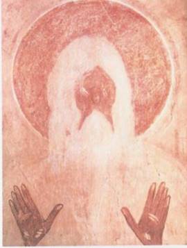 Но вот, чудесным образом, феофановский Серафим с настороженным, недобрым взглядом перекликается с ... врубелевским Демоном, возникшим, когда этот Серафим был еще наглухо закрыт штукатуркой. И не успокоенными, удовлетворенными своими свершениями показал нам всех этих праотцов и отшельников Феофан Грек, а борющимися, напрягающими всю свою энергию, чтобы что-то сокрушить в себе и вокруг. Как раздвинуты пальцы столпников и как красноречивы их ладони! Да, у каждого по-своему, выражая извечную трагедию мятущегося духа. Суров и чуть ли не гневен лик Христа. А какая торжественная, в борьбе обретенная сила в фигуре Мельхиседека! Вглядитесь в Макария Египетского: вслед за Аароном Нередицы, это грандиознейший образ новгородской монументальной живописи, образ, запоминающийся навсегда. Пусть феофановские фигуры в большинстве фронтальны и неподвижны, дух беспокойный, испепеляющий рвется в каждой наружу, рождая тот трагический пафос, ту великую напряженность, которые и являются истинным содержанием феофановской росписи. Суровые и вдохновенные феофановские аскеты — это не царственно мудрые, велеречивые проповедники веры и ревностные обличители зла, а мятущиеся, собственными страстями одолеваемые искатели истины.[8]
