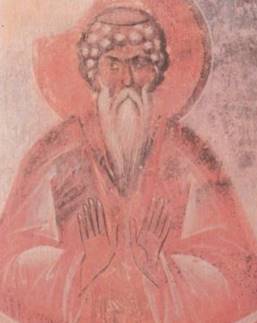 Образ святого Алипия (жил в 7 веке), проведшего пятьдесят три года на башне-столпе, уподобляясь Христу в своих добровольных стараниях, особенно впечатляет. Согласно его Житию, Алипий был так угоден Господу, что еще при жизни его озарял небесный Божественный свет: святой вместе со своей башней как бы превращался в световой или огненный столб, восходящий от земли к небесам. Феофан, в полном соответствии с Житием Алипия, изображает святого, просвещенного Божественным светом: вся его фигура (земная плоть), исполненная земляной коричневой краской, сплошь покрыта белильными бликами, передающими Божественный свет, а седые волосы на голове и длинная борода как бы сотканы из «световой материи» небесного сияния.[23]