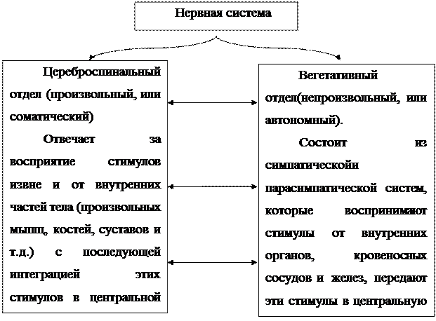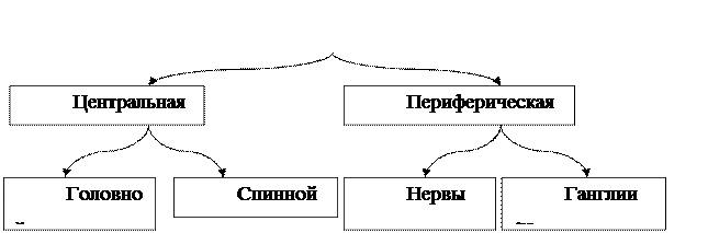 На рисунке слева показано анатомическое расположение органов нервной системы. По рисунку видно, что центральный отдел нервной системы (головной и спинной мозг) сосредоточены в голове и в позвоночном канале, в то время как органы периферийного отдела нервной системы (нервы и ганглии) рассредоточены по всему организму. Такое устройство нервной системы наиболее оптимально и выработалось эволюционно.