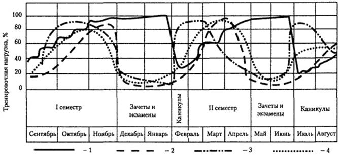 1 - умственная учебная нагрузка, 2 - интенсивность физической нагрузки, 3 - объем физической нагрузки, 4 - общая тренировочная нагрузка