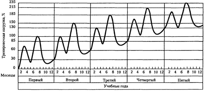 Рис. 6.3. Примерное перспективное планирование общей тренировочной нагрузки на 5 лет обучения в вузе