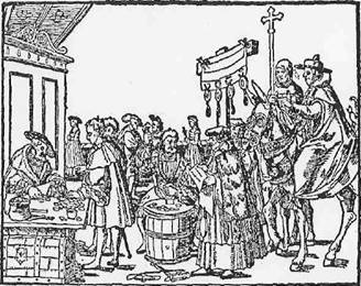 Епископ в свою очередь занял денег у Фуггеров и, чтобы выплатить им долг, с согласия Льва X, поставил Тетцеля на продажу индульгенций. Учение церкви относительно этого вопроса было весьма сложным, но Тетцель его упростил, сведя к постой формуле: заплати, и будут прощены не только души усопших, но и покупатель индульгенции будет практически волен совершить любой желанный ему грех.