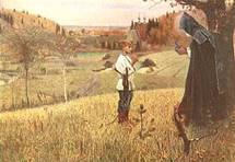 В пору господства передвижнической эстетики Нестеров ищет себя в бытовом жанре ("Жертва приятелей", "Знаток", обе 1884) и историческом ("Избрание Михаила Федоровича на царство", "До государя челобитчики", обе 1886). Но к концу XIX столетия художник переходит к религиозной тематике: его привлекает аскетическая строгость монашества, красота православных обрядов, жизнь в согласии с природой. Картины этого цикла ("Пустынник", 1888; "Видение отроку Варфоломею", 1889-90; "Подблаговест", 1895, и др.) окрашены созерцательным любованием; стилистически они обнаруживают влияние стиля модерн - в панорамности композиций, в чуть гобеленном цвете, в замене развернутого действия состоянием.