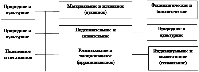 В структуре менталитета, представленного на рис.1, его компоненты образуют диалектические взаимосвязанные и взаимодействующие крайне острые противоречия, различные ментальные типы и соответственно отражают этнические особенности общества. С одной стороны, ментальность является результатом взаимодействия последнего с менталитетом, с другой – врожденные способности делают его предрасположенным к конкретным типам поведения и деятельности. Но реальное формирование ментальности происходит под