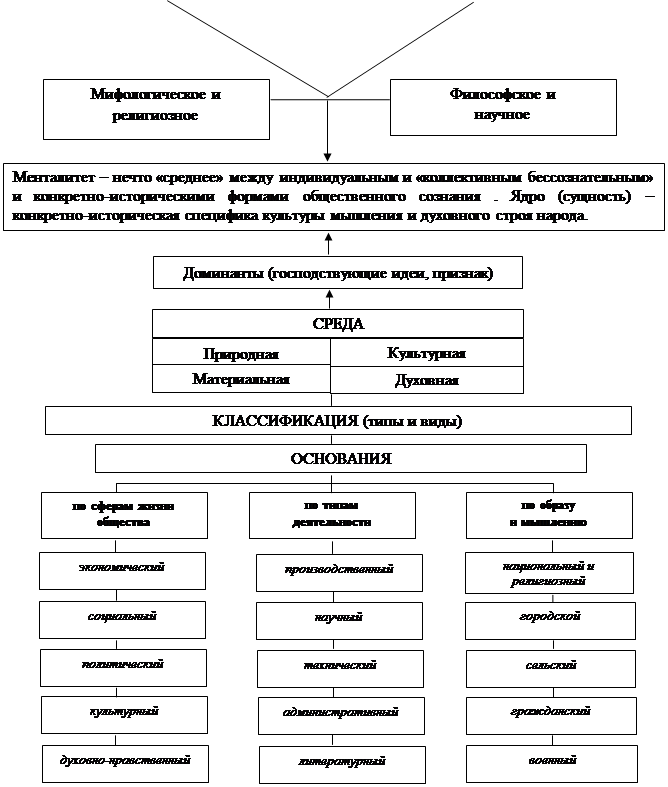 Ментальность определяется как характеристика либо одной личности, либо определенного общества или сообщества в целом. Существенный вклад в разработку проблемы ментальности внес К.Г.Юнг. Предложенный им термин «архетип»( греческое слово архетип в переводе означает первообраз ) по своему содержанию близок к менталитету. Динамика времени определяется и выражается господствующими в обществе архетипами; смена времен означает смену архетипов или, по крайней мере, способов их проявления и акцентуации. Как правило, ведущие архетипы эпохи завуалированы и опосредованы социальными ритуалами и общепринятыми полусознательными представлениями, с которыми никто не спорит и даже не ставит под сомнение - просто потому, что это не приходит в голову. Воздух, которым мы дышим, не является предметом обсуждения - до тех пор, пока он не меняет решительно своего химического состава, к которому нужно заново адаптироваться или, если это оказывается невозможным, качественно его менять. По этой причине не вдаваясь в их анализ, под менталитетом будем понимать определенную совокупность тех компонентов сознания, которые обусловливают его структурную целостность и качественную социальных (этнических) общностей.