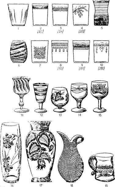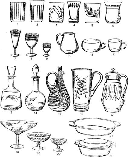 стаканы прессованные:1- цилиндрический; 2-конический с гранями; стаканы выдувные: 3- цилиндрический; 4- с утолщенным дном; 5- конический; 6- фасонный; рюмочные изделия: 7- бокал; 8- фужер; 9- рюмка; 10- молочник; 11- чашка для бульона; 12- кружка; графины: 13- для воды; 14- для вина без ручки; 15- то же, с ручкой; 16- кувшин без крышки; 17- то же, с крышкой; вазы: 18- для фруктов; 19- для печенья; 20- для крема; 21- сковорода из жаростойкого стекла; 22- кастрюля с крышкой из жаростойкого стекла.