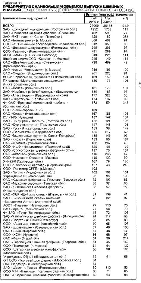 Производство швейных изделий в фактических (учитывающих рост цен) отпускных ценах без НДС, включающих стоимость давальческого сырья в I полугодии 2009 г. после 3 лет роста сократилось на 8,1 % и составило 24069 млн руб. По физическому объему (без учета роста цен) выпуск уменьшился на 16,1 % (вместе с меховыми изделиями, доля которых в общем объеме менее 5 %).