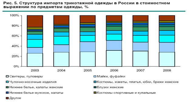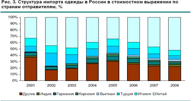 При этом российские производители одежды обеспечили только 3,4% совокупного спроса на нее. Столь значительный объём импорта достигается за счёт того, что многие отечественные бренды размещают заказы на пошив одежды за границей ввиду сложностей с организацией и ведением производства у себя на родине. Выпуск же одежды на отечественных предприятиях довольно затратен и связан со значительными трудностями. По итогам 2008 года объём импортных поставок в страну составил почти 968 млрд руб.
