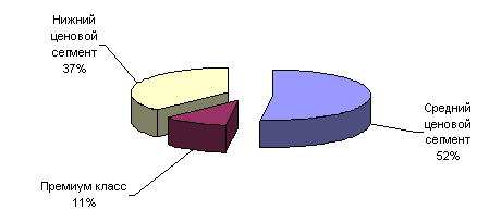 · Основным ценовым сегментом в структуре рынка одежды в 2008 году стал среднеценовой сегмент - 68% всех продаж одежды в стоимостном выражении.