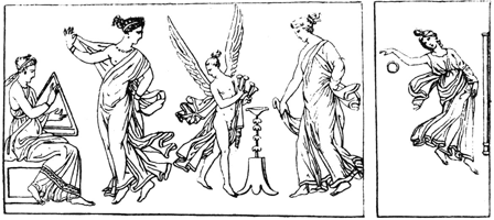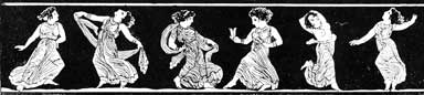 Греческие танцы. Пляски вакханок, изображенные мастером письма по керамике Гиероном. Описание таких греческих танцев как Корибантиум и Гормос. Запечатленная на вазе пляшущая вакханка и скульптура танцовщицы из терракоты. Танцы, в которых участники держались за руки и Панатеический танец на керамической посуде. Танец воинов с Ватиканской скульптуры и греческие танцоры с кастаньетами. Рисунки цимбал и дудочек, хранящихся в Британском музее. Хор. Греческие танцоры и акробаты.