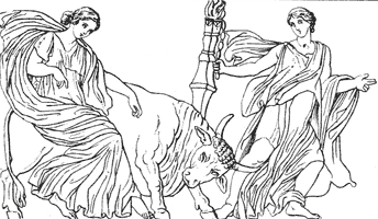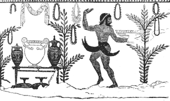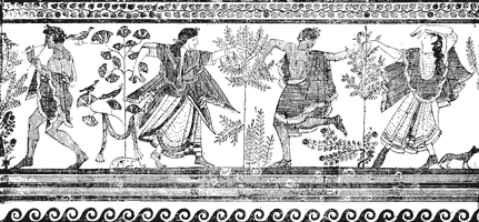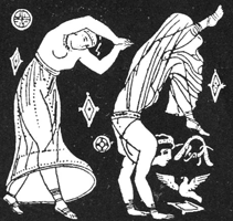 Пора Эпиленийского (Epilenios) танца наступала, когда во всех садах виноград был собран и выжат – танцоры своими движениями имитировали эти процессы. А когда вино было готово и разливалось по чанам исполнялся Антистерий (Anteisterios) (рис. 8 , 9 , 10 ) и танец, посвященный Бахусу – Вакханалия (Bahilicos), сопровождавшаяся звуками цимбал и тамбуринов, а заканчивавшаяся обычно оргиями.