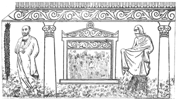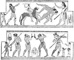 Найденные реликвии свидетельствуют о том, что греки и финикийцы некоторое время значительно влияли на этруссков (рис. 20 ). Об этом говорит и изображение танцора на гробнице в Вази Дипинти, Корнето. Мистер Деннис (Dennis) [6 ] относит его к архаичному периоду – примерно 6 в. до н. э. Оно демонстрирует более сильное сильное греческое влияние, чем другие сохранившиеся изображения. На рис. 21 показан боевой танец, исполняемый под звуки дудочек, найденный в Grotta della Scimia в Корнето. Он имеет более выраженный национальный характер.