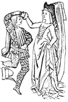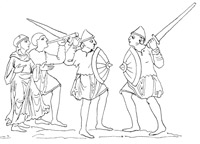 Арбо: Войдя в помещение, где собрались люди, желающие потанцевать, выбери достойную юную леди (заслуживающую внимания молодую даму) и, приподняв шляпу или берет правой рукой, подай левую, приглашая танцевать. Она, знающая и воспитанная, предложит левую руку и поднимется, чтобы последовать за тобой. Потом, на виду у всех, проведи ее в конец комнаты и попроси музыкантов начать играть бассданс, поскольку иначе по ошибке они могут начать играть какой-нибудь другой танец. И когда они начнут играть, начинай танцевать. Будь осторожен и обрати внимание на то, чтобы музыканты верно поняли, что, попросив бассданс, ты имел ввиду обычный и распространенный вариант. Впрочем, если одна мелодия, на которую положен танец, нравится тебе больше, чем другая, ты можешь напеть им ее начало.