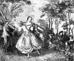 Неудивительно, что в некоторых из балетов практиковалось ношение маски, этой возрожденной античной традиции. Опера-балет тех дней дала нам множество знаменитых музыкантов, таких как Детуш (Destouches), придавший балетной музыке новую «силу», и Рамо (Rameau). Жан-Жорж Новерр (Jean Georges Noverre) убрал вокальные партии и ввел пятиактовый балет на основе собственных разработок в 1776. Наверное, в какой-то степени он последовал совету Гаррика (Garrick), с которым познакомился в Лондоне. Многочисленны имена известных танцоров XVIII века, таких как Пекур (Pécourt), Блоди (Blaudy) (учитель мадемуазель Камарго), Лаваль (Laval), Вестри (Vestris), Жермен (Germain), Прево (Prevost), Лафонтен, и Камарго (Camargo) (рис. 61 ); так же, как и танцоров века XIX — Таглиони (Taglioni), Гризи (Grisi), Дюверне (Duvernay), Черрито (Cerito), Элслер (Ellsler) и др., а также многих, знаменитых в наши дни. По сути, простое упоминание всех имен было бы отдельной работой.
