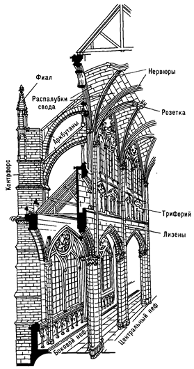 Боковой распор свода главного нефа передается с помощью опорных арок (аркбутанов) на наружные столбы - контрфорсы. Освобожденные от нагрузки стены в промежутках между столбами прорезаются арочными окнами. Нейтрализация распора свода за счет вынесения наружу основных конструктивных элементов позволила создать ощущение лёгкости и творческое величие усилий человеческого коллектива.