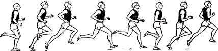 Техніку бігу умовно поділяють на старт і стартове прискорення, біг по дистанції і фініш. Біг на середні і довгі дистанції відрізняється від спринту меншою довжиною кроків і більш прямим положенням тулуба, менш високим підйомом коліна махової ноги, нерізким випрямленням поштовхової ноги, роботою рук і більш глибоким і ритмічним диханням (рис.5).