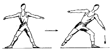 3. Быстрые шаги без отягощения вперед, назад, влево, вправо с касанием земли рукой при каждой смене направления - 1 мин (по 2-3 шага).